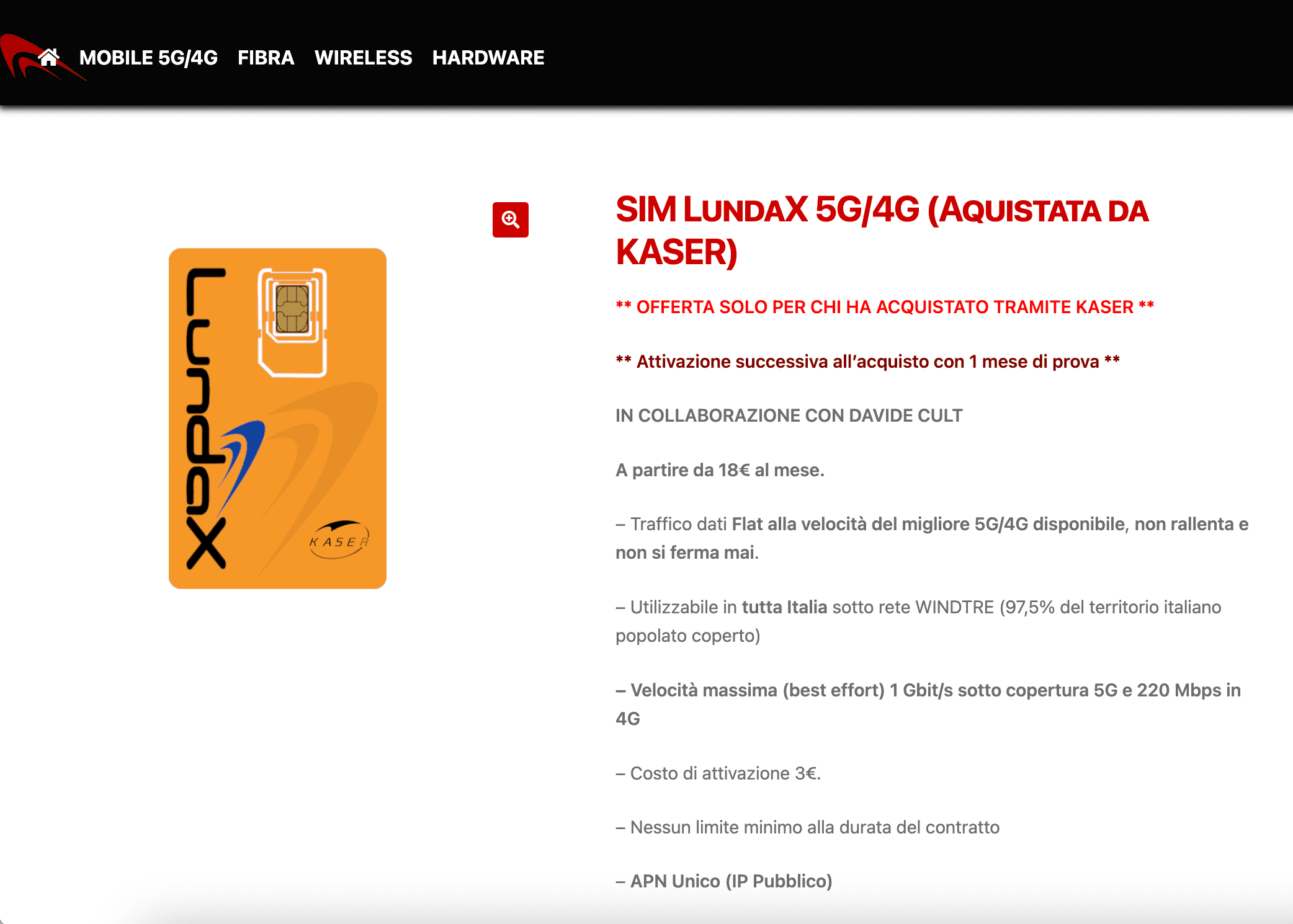 L'offerta esclusiva dedicata a coloro che acquistano le nostre antenne e sono alla ricerca di una soluzione per navigare senza limiti in Italia! Aggiungi al carrello la sim LundaX e riceverai gratuitamente la tua nuova sim insieme l'antenna acquistata. L'attivazione costa solo 3 euro e, scegliendo un abbonamento minimo di due mesi, LundaX vi offre un mese di prova gratuito, senza vincoli contrattuali. Per ulteriori dettagli e informazioni di attivazione, visita il sito: https://lundax.com/kaser